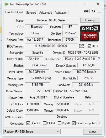 Hi, I have 6x RX 580 Sapphire nitro+ (4x hynix and 2x Samsung) on win 10. Have eth 29mh/s + sia around 600.(Im used afterburner GPU Clock: 1150 and Memory Clock: 2150 on hynix).