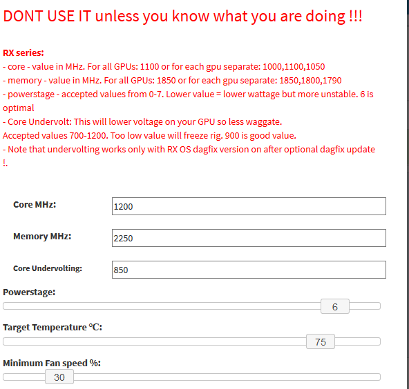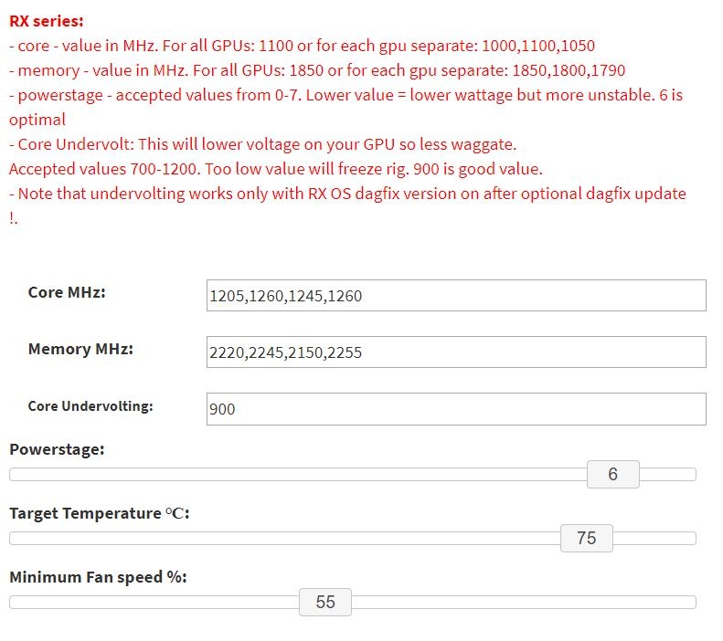 Hi, try -cclock 1200 -mclock 2250 -cvddc 850 -mvddc 900 or -cclock 1200 -mclock 2200 -cvddc 850 -mvddc 900