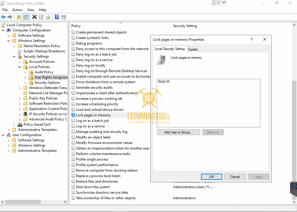 Also if you notice low hashrate you could try to add your username to “Lock pages in memory”. Go to gpedit.msc -> Windows Settings -> Security Settings -> Local Policies -> User Rights Assignment and look for “Lock pages in memory“, double click to open it, click “Add user or group” and type in your PC username, apply settings and reboot the machine. You can also try to increase virtual memory as we do on gpu mining rigs.