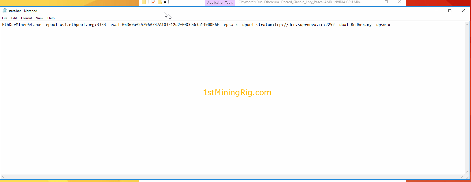 - Replace everything with the following code: EthDcrMiner64.exe -epool eu1.ethermine.org:4444 -ewal WALLET_KEY.RIG_NAME -epsw x -dpool stratum+tcp://pasc.suprnova.cc:5279 -dwal SUPRNOVA_USERNAME.SUPRNOVA_WORKER_NAME -dpsw SUPRNOVA_PASSWORD -dcoin pasc -dcri 10