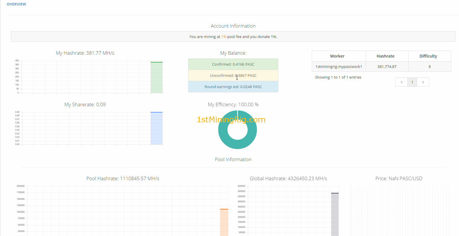 thank u for ur fast response. also how long should it take for me to receive something in myetherwallet? ive been mining for about 2 hours now and still nothing. also how come the PASC at supernova doesnt show any MH for the Global hash?