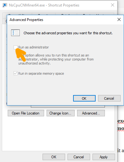 - Create shortcut for NsCpuCNMiner64.exe on desktop, you must be logged as admin aswel
