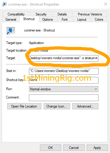 1 Will use ccminer-cryptonight (A modification of Christian Buchner’s & Christian H.’s ccminer project by tsiv for Cryptonight mining.). You can download it from https://github.com/tsiv/ccminer-cryptonight/releases 2 Once downloaded, extract its contents 3 Send a desktop shortcut of Right click of “ccminer.exe” by right clicking it and then choose “Send to” -> “Desktop” 4 On desktop shortcut that we have just created right click on it and go to properties 5 In target field paste the following code -o stratum+tcp://monerohash.com:3333 -u YOUR_WALLET_KEY -p x, paste it right after “C:\Users\monero\Desktop\monero nvidia\ccminer.exe”, so the full code will look exactly like this “C:\Users\monero\Desktop\monero nvidia\ccminer.exe” -o stratum+tcp://monerohash.com:3333 -u YOUR_WALLET_KEY -p xMonero AMD GPU Mining