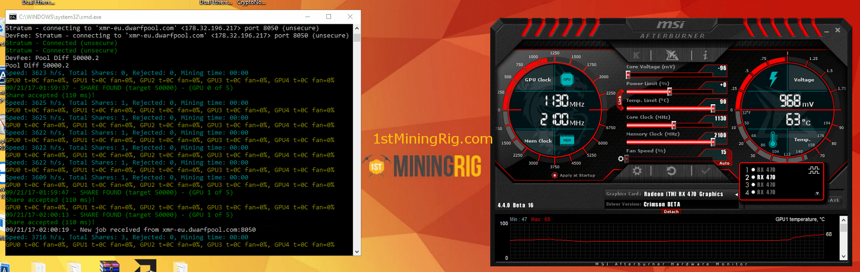 - If you want to control the fans directly from miner’s .bat file, you can add right after -p x the following -tstop 85 -tt 65 -fanmin 60 -fanmax 100, also you can control the clocks and voltage, all you have to do is to use the following commands: for setting up the clocks -clock (core clock) and -mclock (memory clock), as for undervolting -cvddc (core clock) and -mvddc (memory clock). This time i am using a rig of 5x Sapphire Nitro+ RX 470 4gb and the command line will look like this -cclock 1130 -mclock 2100 -cvddc 875 -mvddc 900 (note that you still have to find the best clocks and udnervolt for your rig, this is how mine works the best)’