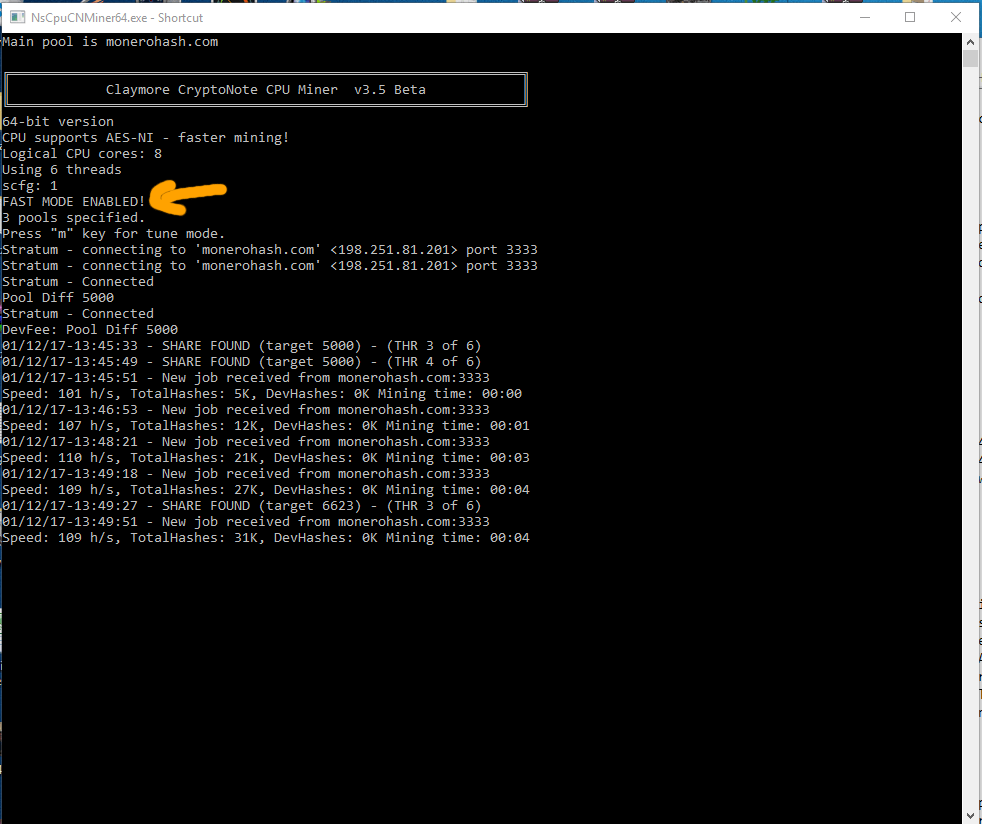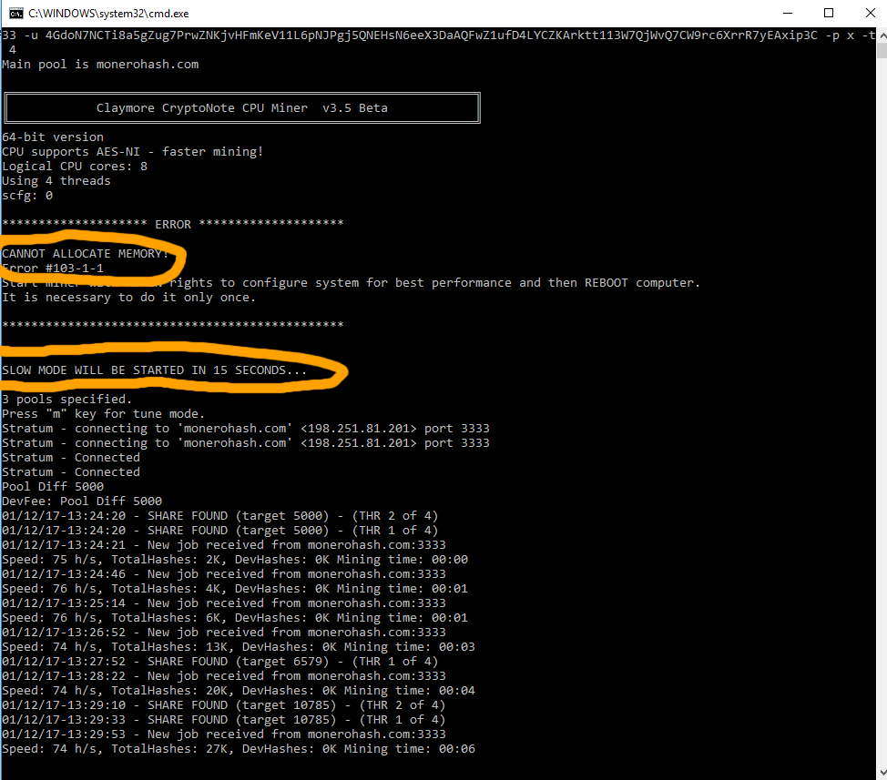 1 First step is to download the miner, i will be using Claymore’s CryptoNote Windows CPU Miner v3.5, download it from here , read more about the miner here 2 Once downloaded extract the contents in a folder and access it. 3 Then open “pool 32bit.bat” or “pool 64bit.bat” (depends what windows version you have) with notepad and paste the following code: “NsCpuCNMiner64 -o stratum+tcp://monerohash.com:3333 -u YOUR_WALLET_KEY_HERE -p x -t 4” , don’t forget to replace your wallet key. If you don’t have one it can be generated from your kraken.com account. 4 Now open the “pool 32bit.bat” or “pool 64bit.bat”, in my case ill open “pool 64bit.bat” because i have 64bit windows version. If you notice a message like “CANNOT ALLOCATE MEMORY!” and “SLOW MODE WILL BE STARTED IN 15 SECONDS…” you must do the following steps:-